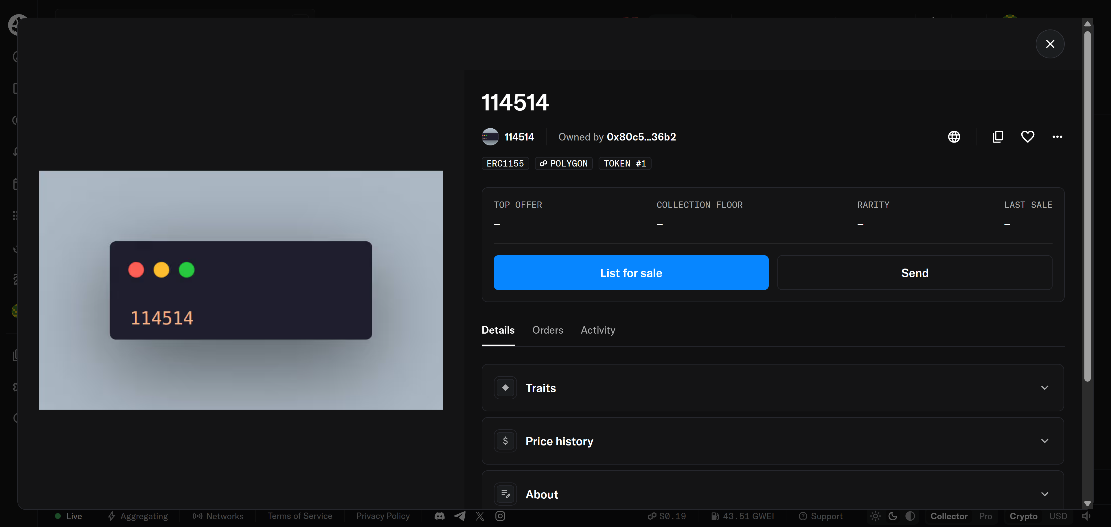 这样,你的NFT就部署完成了!你可以List For Sale,在市场中列出等待别人购买,也可以Send,发送给其他人作为礼物或者纪念品!