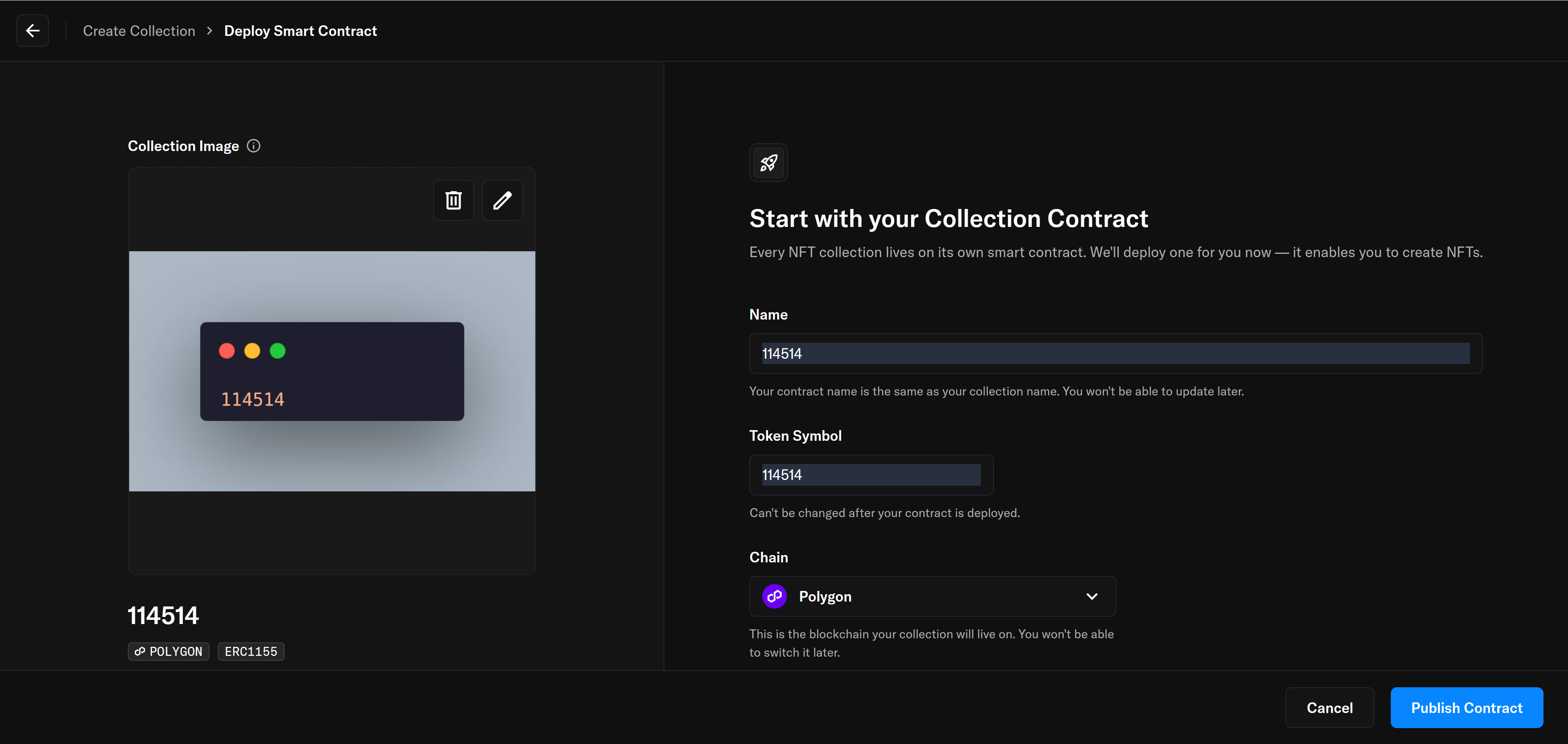 接下来,上传Open Collection的封面,输入合约名称、Token标志。注意Chain的选择,笔者建议使用Polygon,Gas费较低。