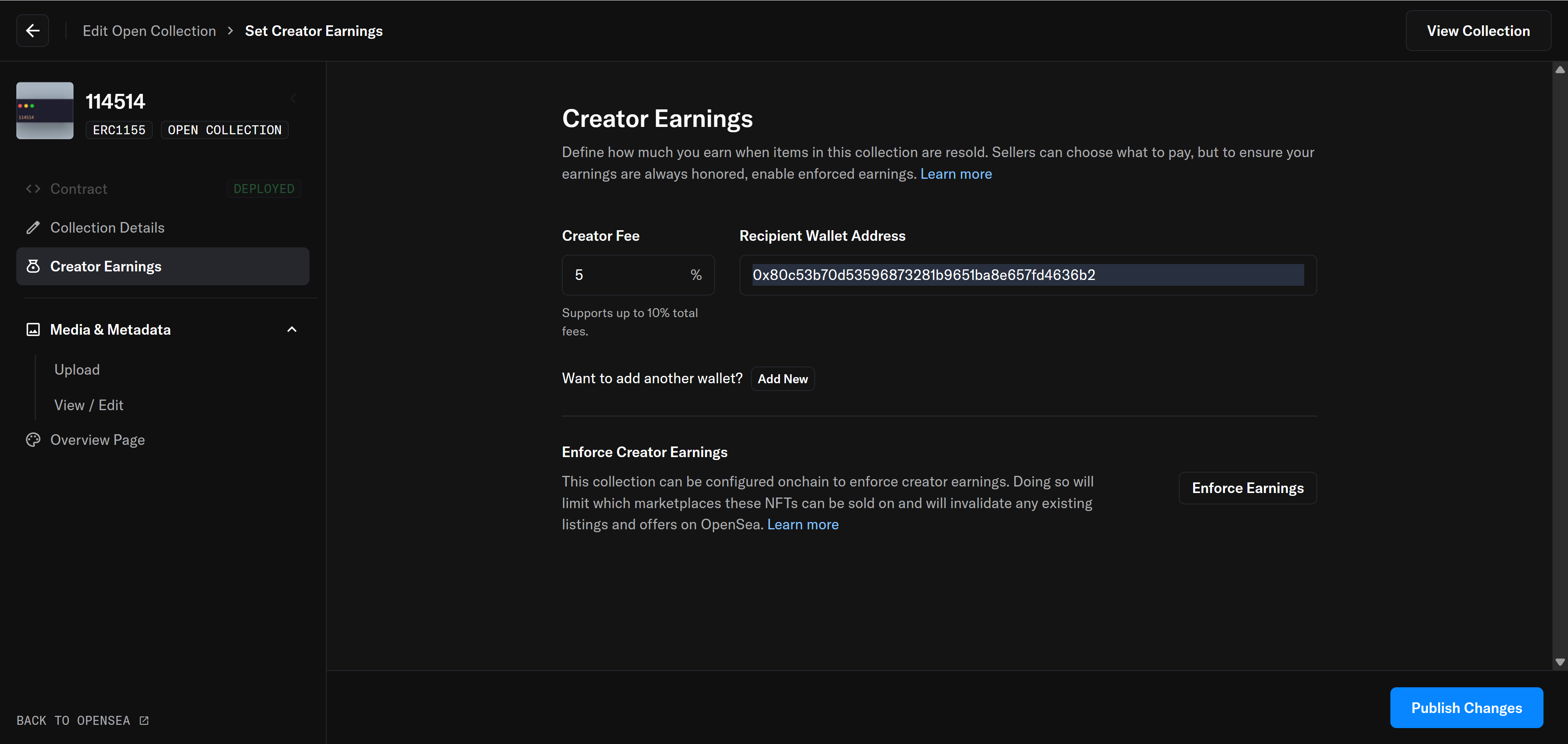 这里就是刚才提到的版税,笔者建议使用5%!Recipient Wallet Address就是版税会到哪里去,输入你的钱包地址即可。